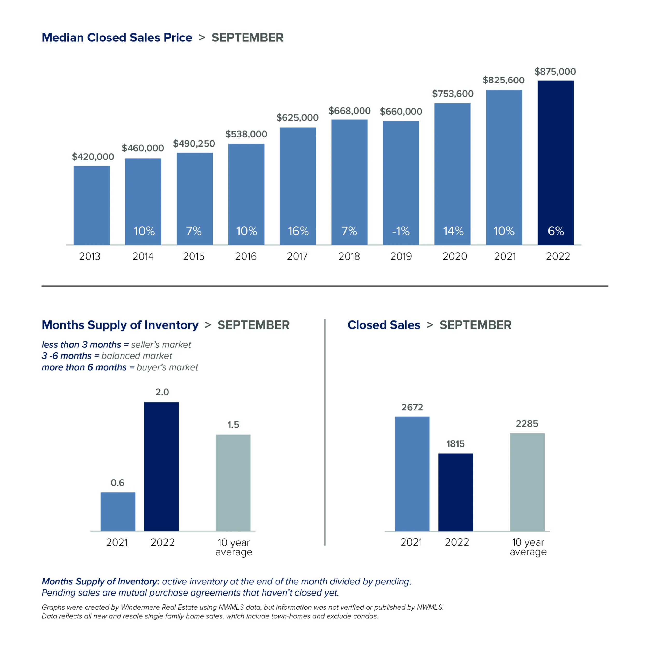 Seattle also saw a slight month-over month decrease in single-family home prices, from a median price of $927,000 in August to $900,000 last month. That’s still up six percent from $850,000 in September 2021. Conversely, year-over-year condo prices slumped a bit, falling to $499,000 last month from $505,000 in September 2021. Condo inventory has increased as well, with buyers benefitting from over two months’ supply. Sellers are encouraged to price wisely and accurately to beat the competition in these conditions.