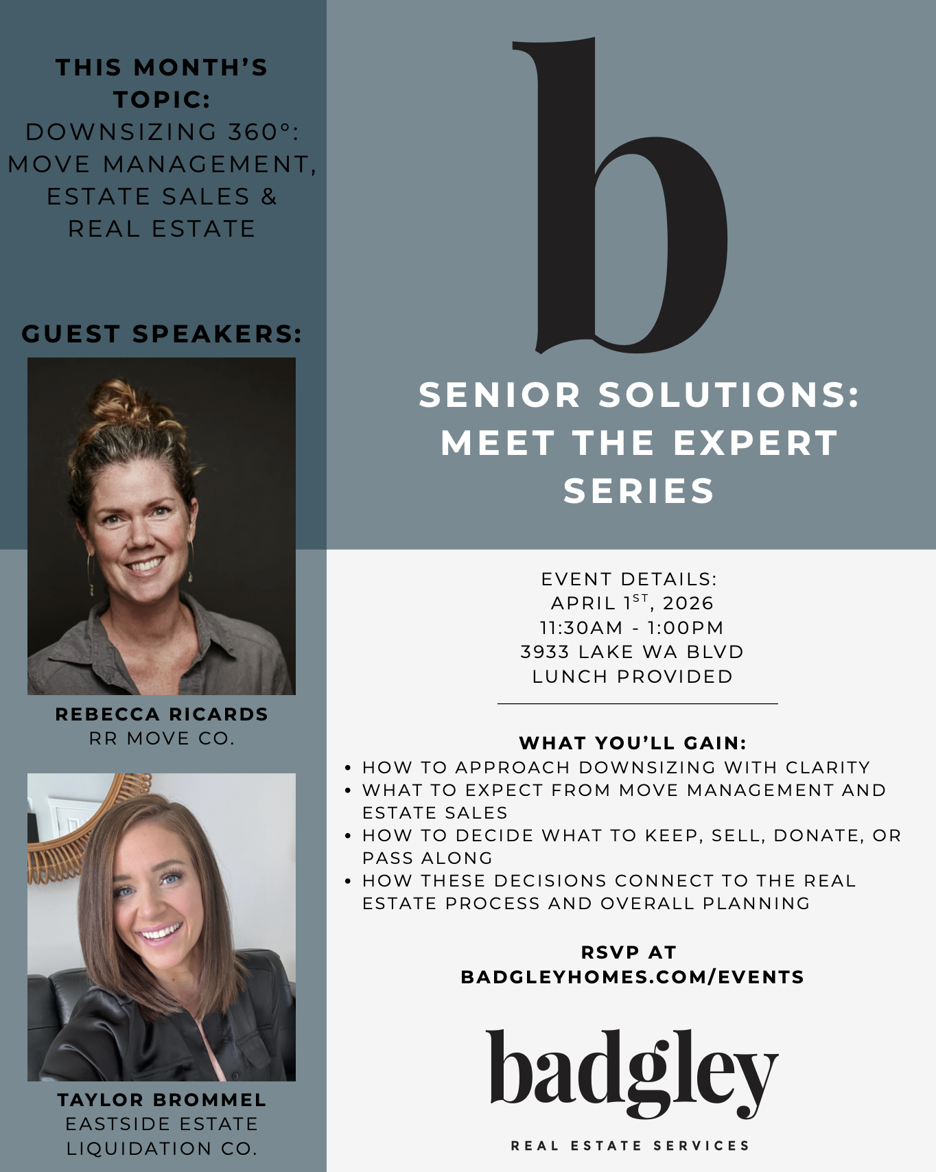 Our April experts include Rebecca Ricards of R&R Move Co. and Taylor Brommel of Eastside Estate Liquidation Co., who will share insight into: